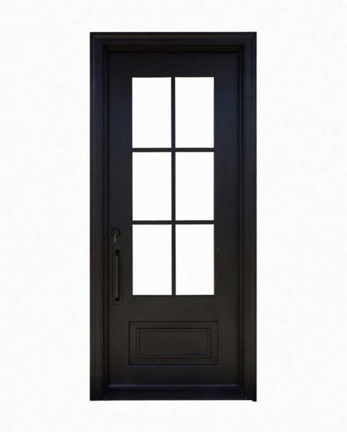 Elevate your entryway with the timeless strength and sophisticated elegance of our custom iron door. Featuring a striking grid pattern across the upper section and a clean, recessed panel at the base, this door commands attention with its bold architectural lines and substantial presence. The sleek, modern handle and robust deadbolt lock add both functionality and a refined touch, creating a seamless blend of security and style that makes a powerful first impression.